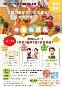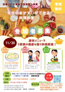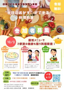 ●物価高騰で運営も徐々に厳しくなってきました。ジャガイモ1袋、人参3本など、少量でも結構です、ご提供いただけるとありがたいです。ただし、傷んで無駄になるといけませんので、こども食堂実施日(第4土曜日)に合わせて事前にご連絡いただけると有難いです。ご協力のほど、よろしくお願いいたします。なお、いただいた食材の数量や賞味期限によっては、市社会福祉協議会が実施されている「日南っ子宅食」にご提供する場合もありますのでご了承ください。